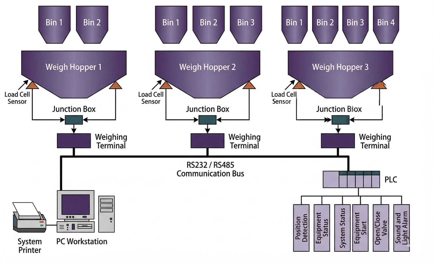1. Sequential Batching: materials from multiple hoppers weighed and added in sequence. Advantages: simple, stable, strong anti-error.