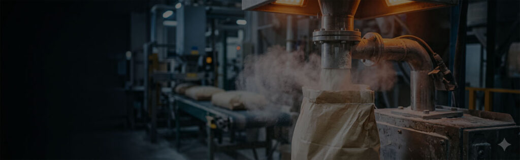 The largest single application for valve bag packing globally. 50 kg paper valve bags are the standard commercial format in most markets. Mn steel wear parts mandatory for acceptable liner life. Impeller fill speed for OPC: 8–12 seconds per 50 kg bag. See our dedicated cement bagging machine page for full technical specification.